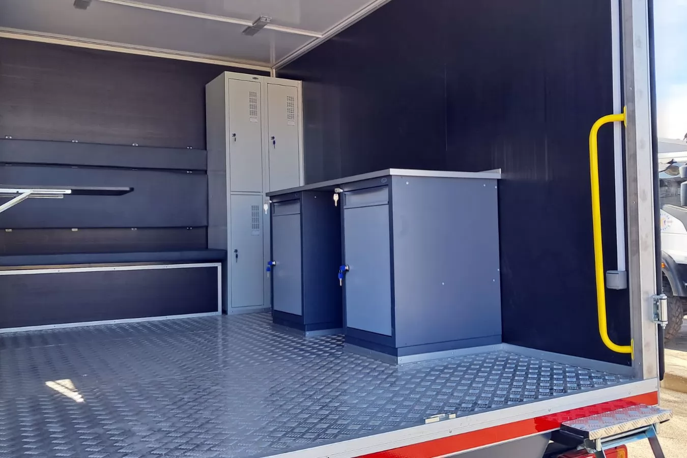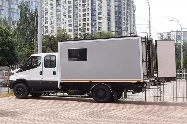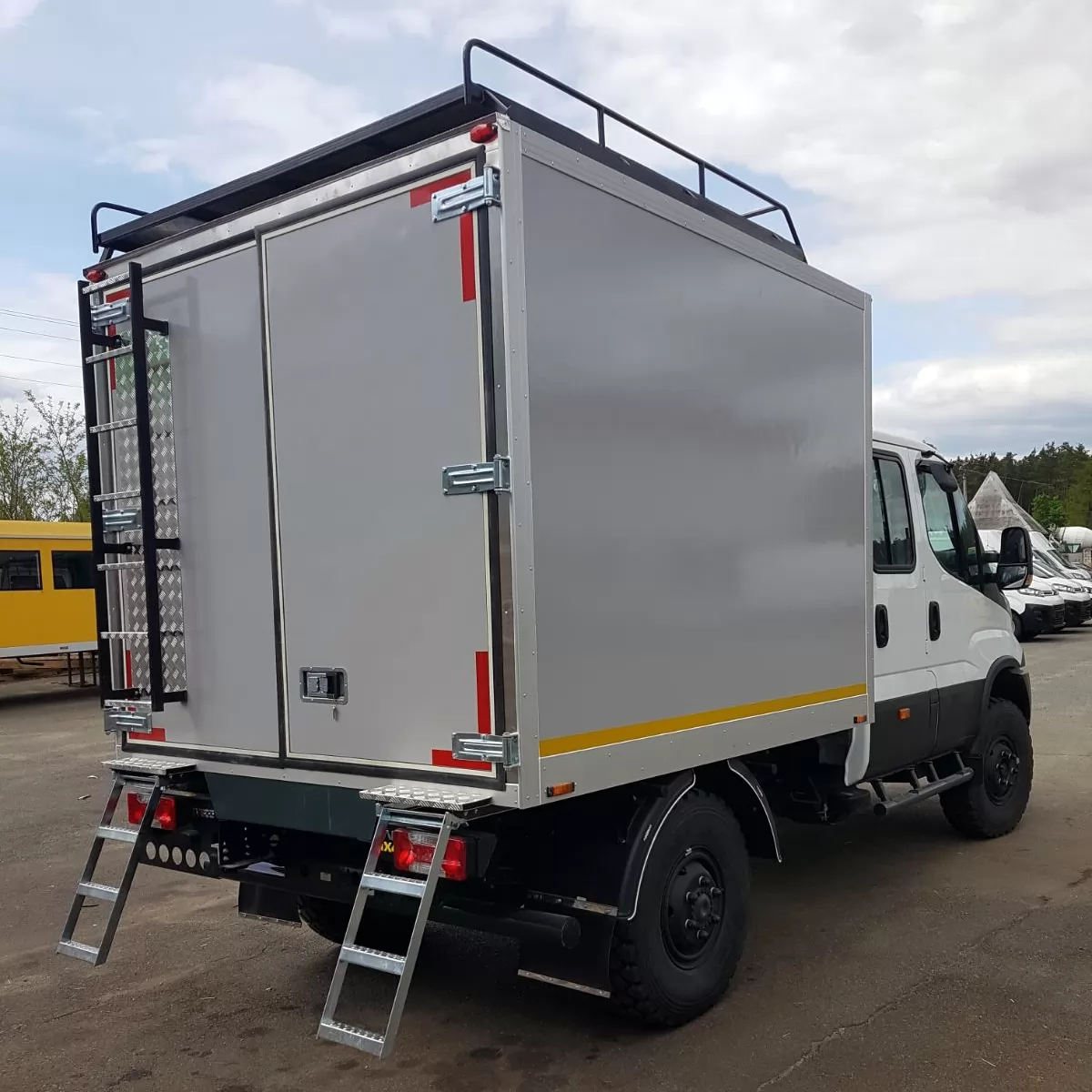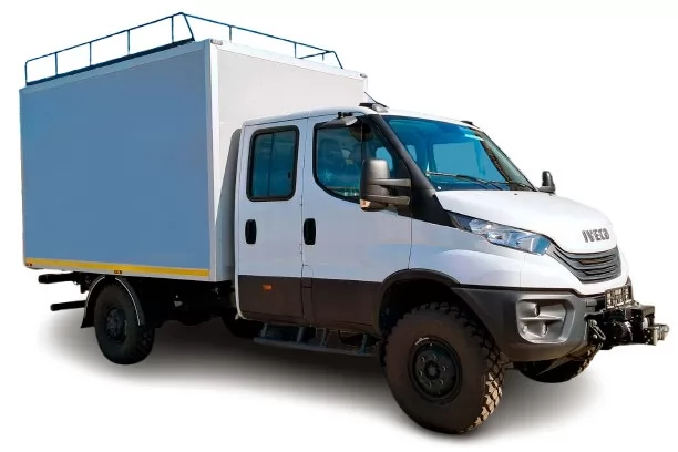 Бригадный автомобиль 4x4 с дубль кабиной на базе полноприводного вездехода IVECO DAILY 55 SW. Автомобиль, благодаря двойной кабине базового шасси, перевозит бригаду численностью 7 человек (включая водителя). В кузовной надстройке расположен рабочий отсек с откидным столом, комфортным сиденьем, в котором расположен ящик для хранения оборудования и специального инструмента. Здесь же расположено несколько шкафов для хранения инструментов и спецодежды.