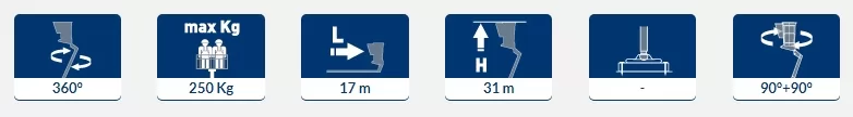 • Максимальная рабочая высота 31 м с максимальным вылетом 17 м