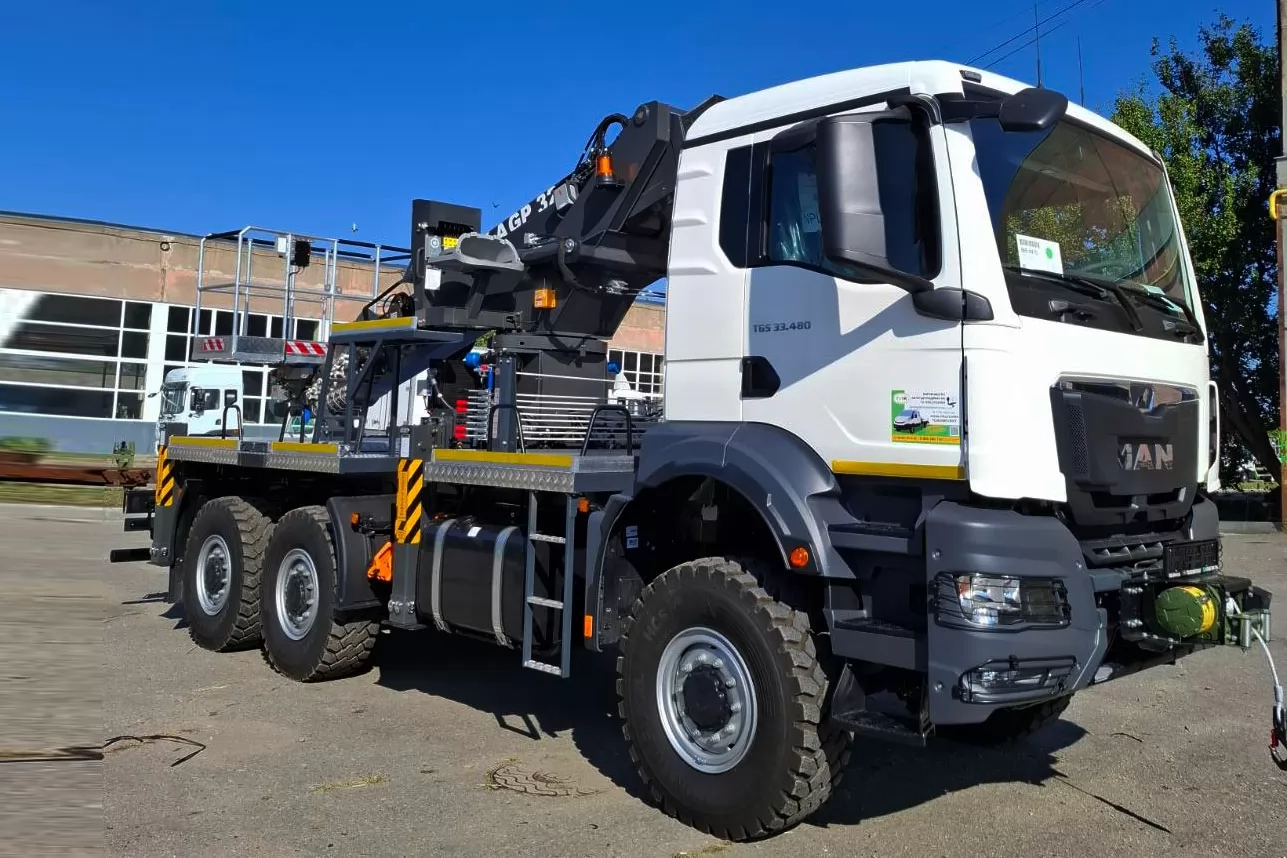 Автовышка DASAN CT320EX/DS320 на MAN TGS 33.480 6x6 дополнена тросовой грузовой лебедкой впереди кабины базового шасси.