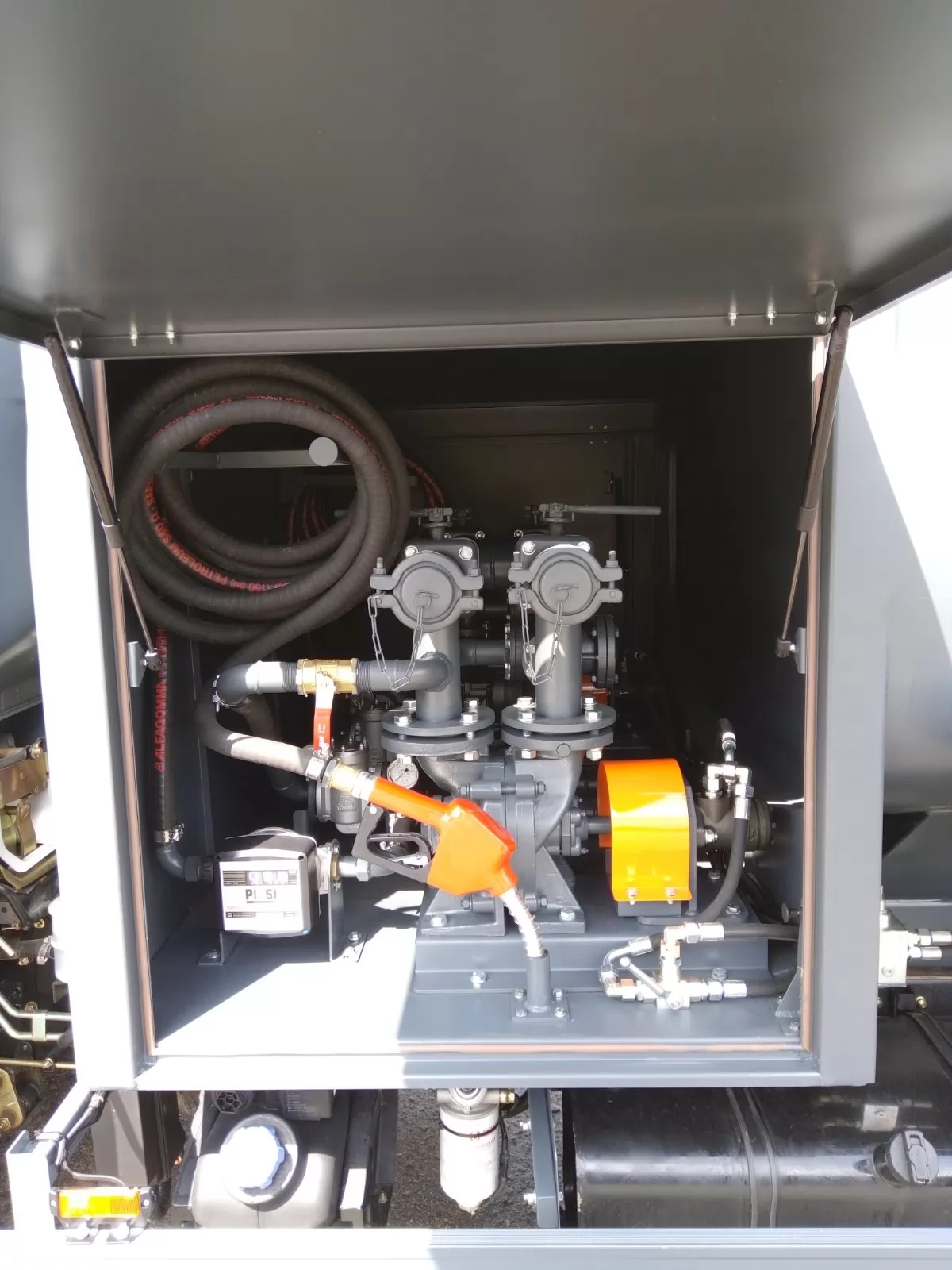 Эта модель имеет раздаточный блок, расположенный за кабиной базового грузового шасси автотопливозаправщика.