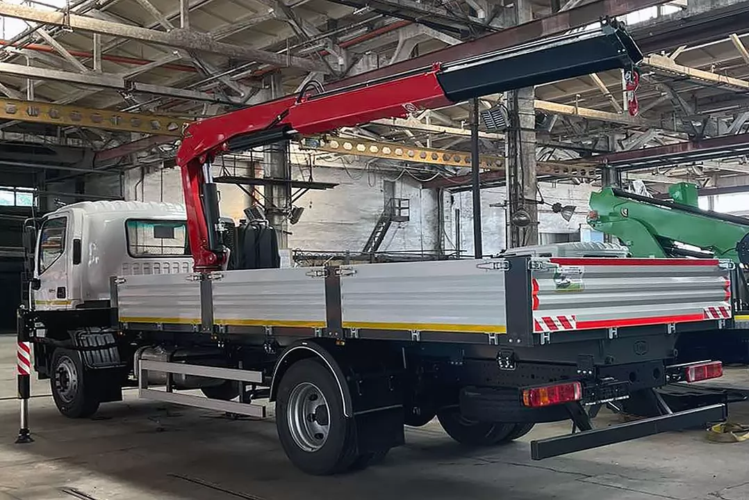 На платформу за кабиной установлен итальянский кран манипулятор FASSI F155A.0.21, который рассчитан на поднятие грузов до 6,3 т на минимальном вылете 2,2 м. Максимальный вылет 1-секционной стрелы 6,35 м (в/п на вылете 6,2 м составляет 2,3 т). Грузовой момент 14,5 тм.