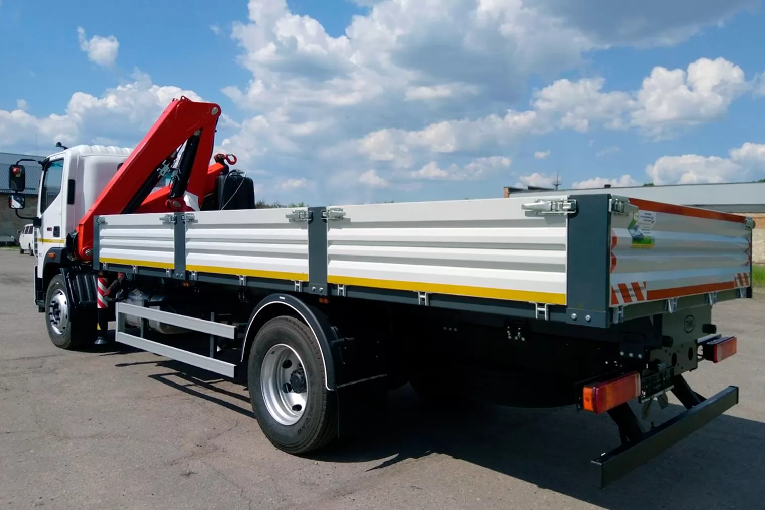Бортовый автомобиль ТК-FOTON-KM-155 на базе FOTON AUMAN BJ 1166 с крано-манипуляторной установкой. 3-сторонняя разгрузка бортов и наличие крано-манипуляторной установки за кабиной делает модель ТК-FOTON-KM-155 очень удобной для загрузки/выгрузки перевозимого груза.