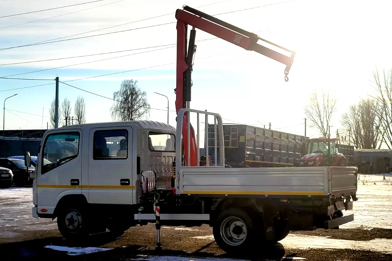Кран-манипулятор монтируется на специальный надрамник. КМУ оснащен балкой с парой гидравлических выдвижных опор и может быть смонтирован как за кабиной автомобиля, так и на задний свес. В данной конфигурации за счет сокращения длины кузова кран-манипулятор установлен за кабиной.