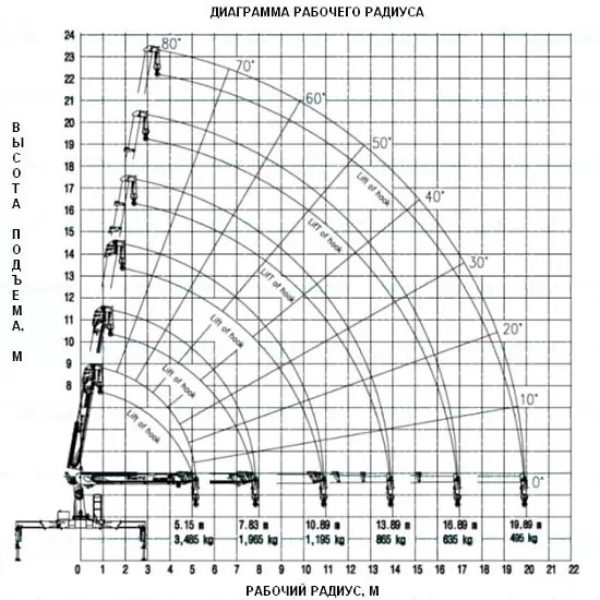 Подъёмная сила, кг/м: 7600/2,0; 3485/5,2; 1965/7,8; 1195/10,9; 865/13,9; 635/16,9; 495/19,9