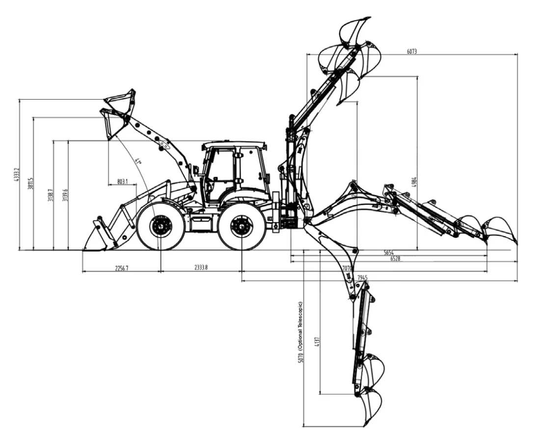 | Модель | Емкость ковша погрузч., м³ | Сила прорыва, кН | Г/п, т | Высота разгр./расстояние сброса, мм | Емкость ковша обратной лопаты, м³ | Макс. глубина копания, мм | Макс. сила тяги, кН | Экспл. масса, т |