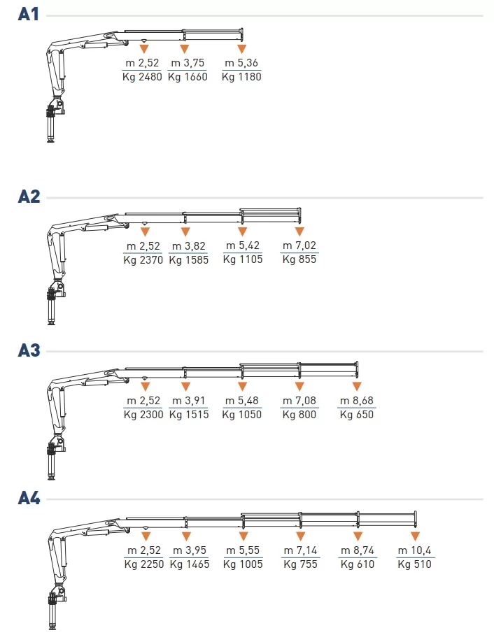 | XC 800 A1 | 6,2 тм | 2480 кг (2,52 м) | 1180 кг (5,36 м) | 8,3 м | 760 кг | 2 шт. |