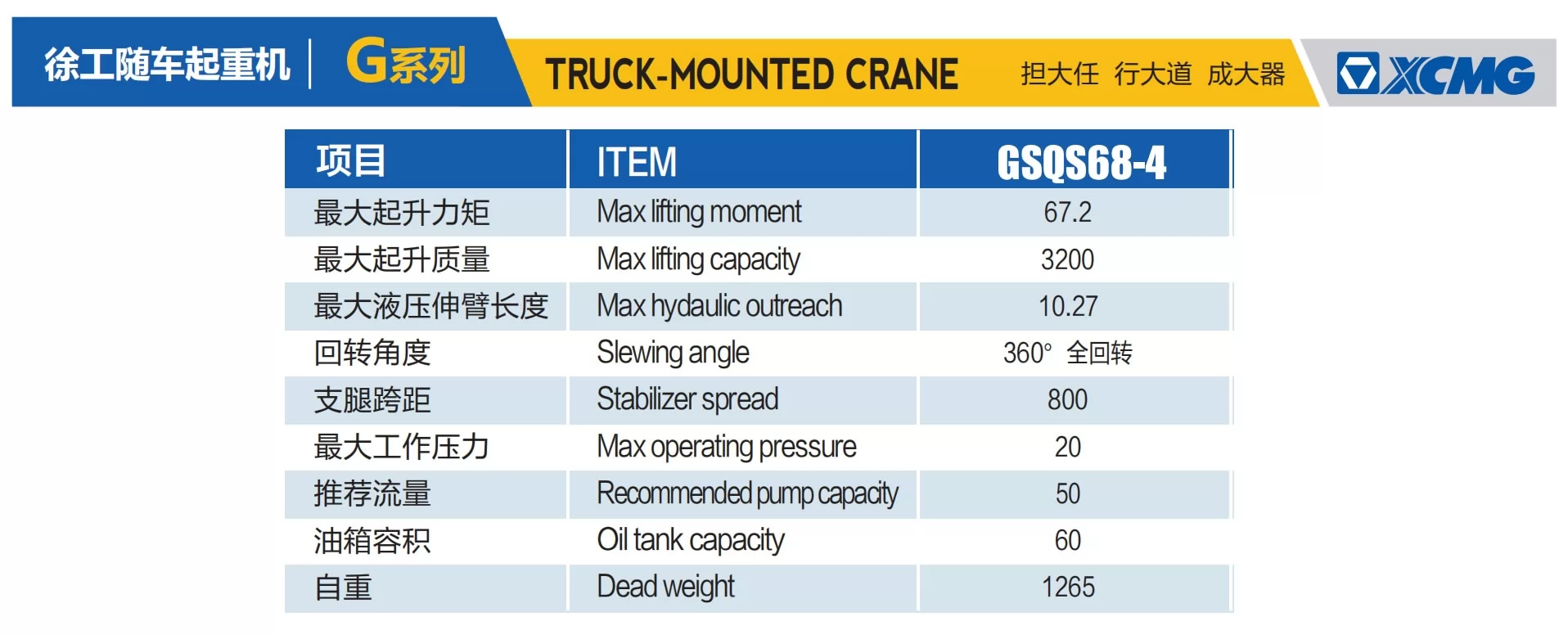 | XCMG GSQS68-4 | 6,72 тм | 3200/350 кг | 2,1/10,27 м | 1265 | 4 |