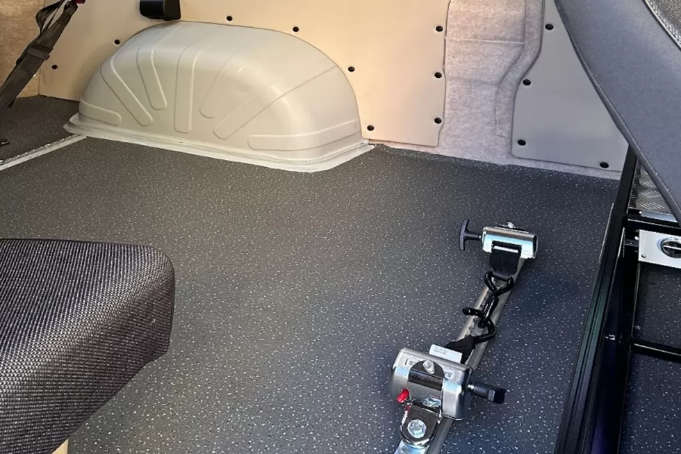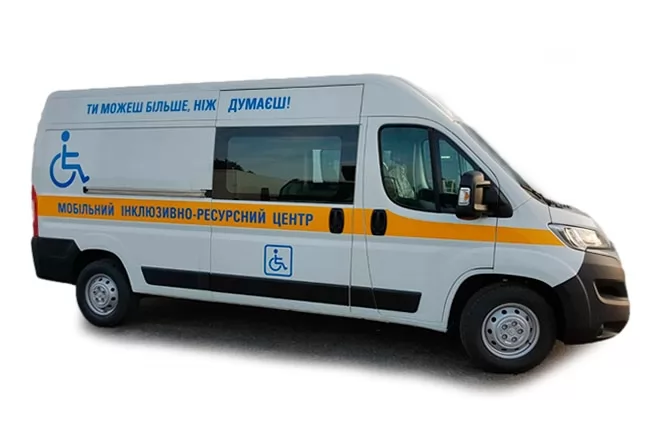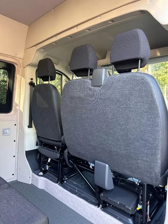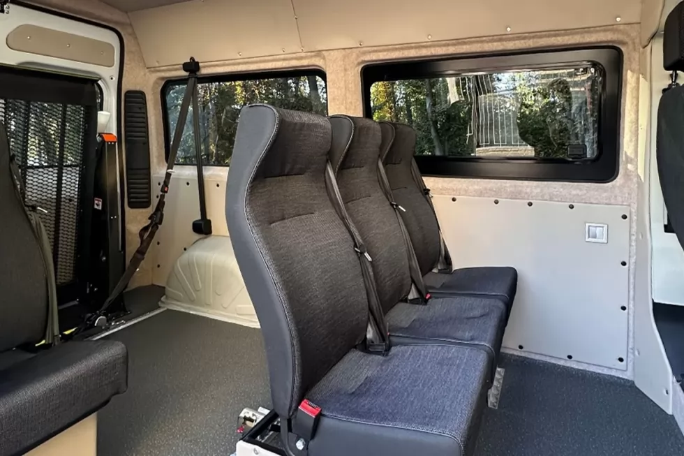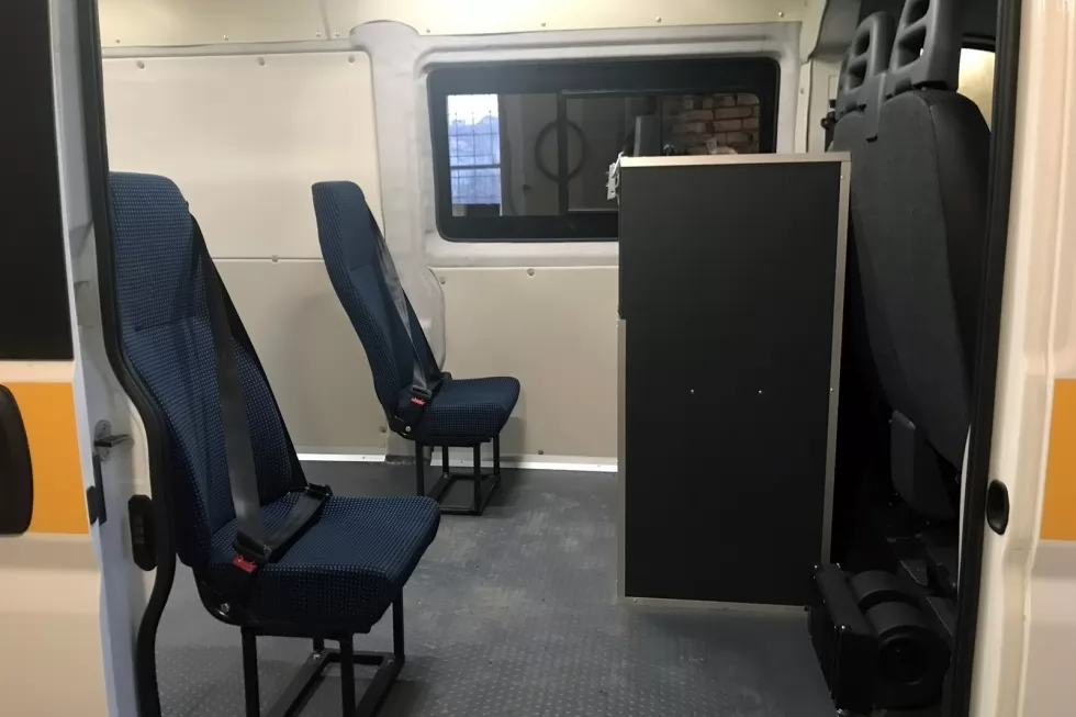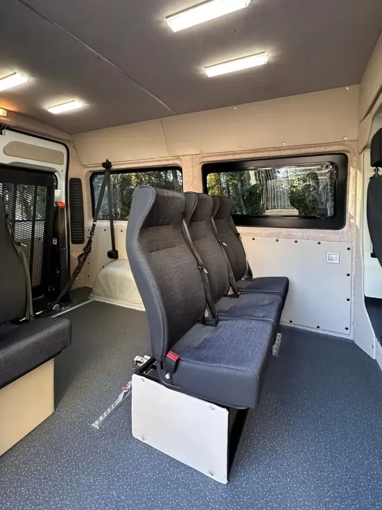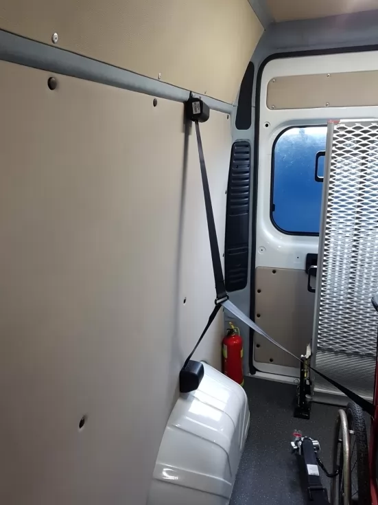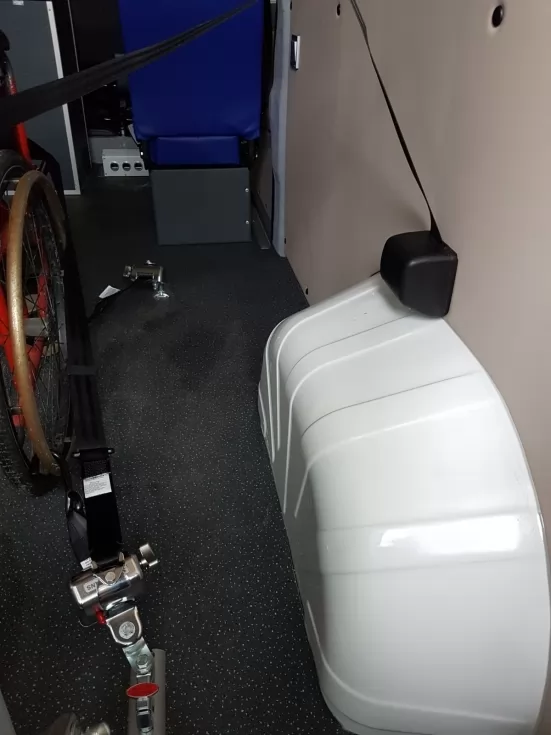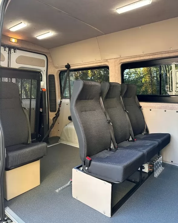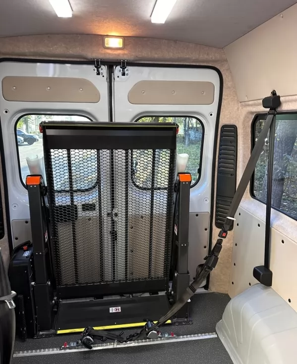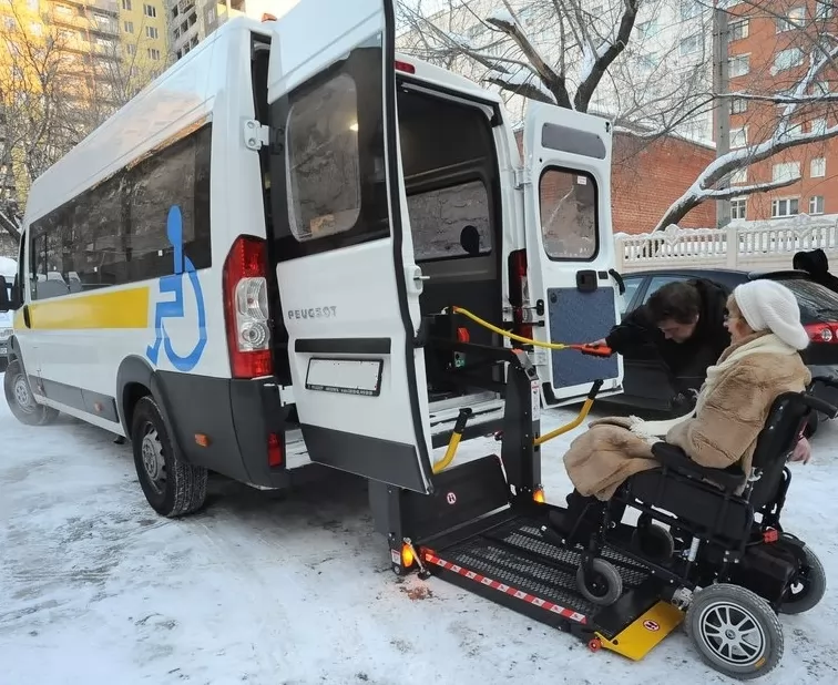 Инклюзивная спецтехника для транспортировки лиц с ограниченными возможностями. Инвалидная коляска надежно зафиксируется, чтобы предотвратить сдвиг во время поездки.