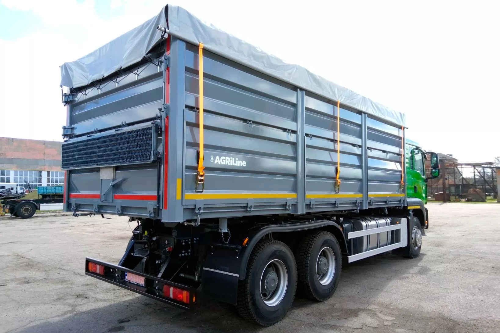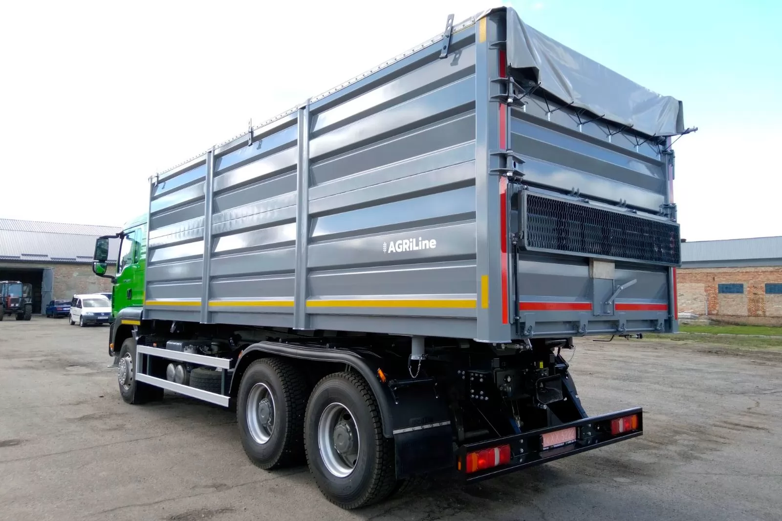 Зерновоз на базе грузовых шасси и прицепной техники. Самосвальный кузов, рассчитанный на транспортировку сельскохозяйственных грузов объемом 32 м3, допустимую нагрузку на базовое грузовое шасси - до 20 тонн.