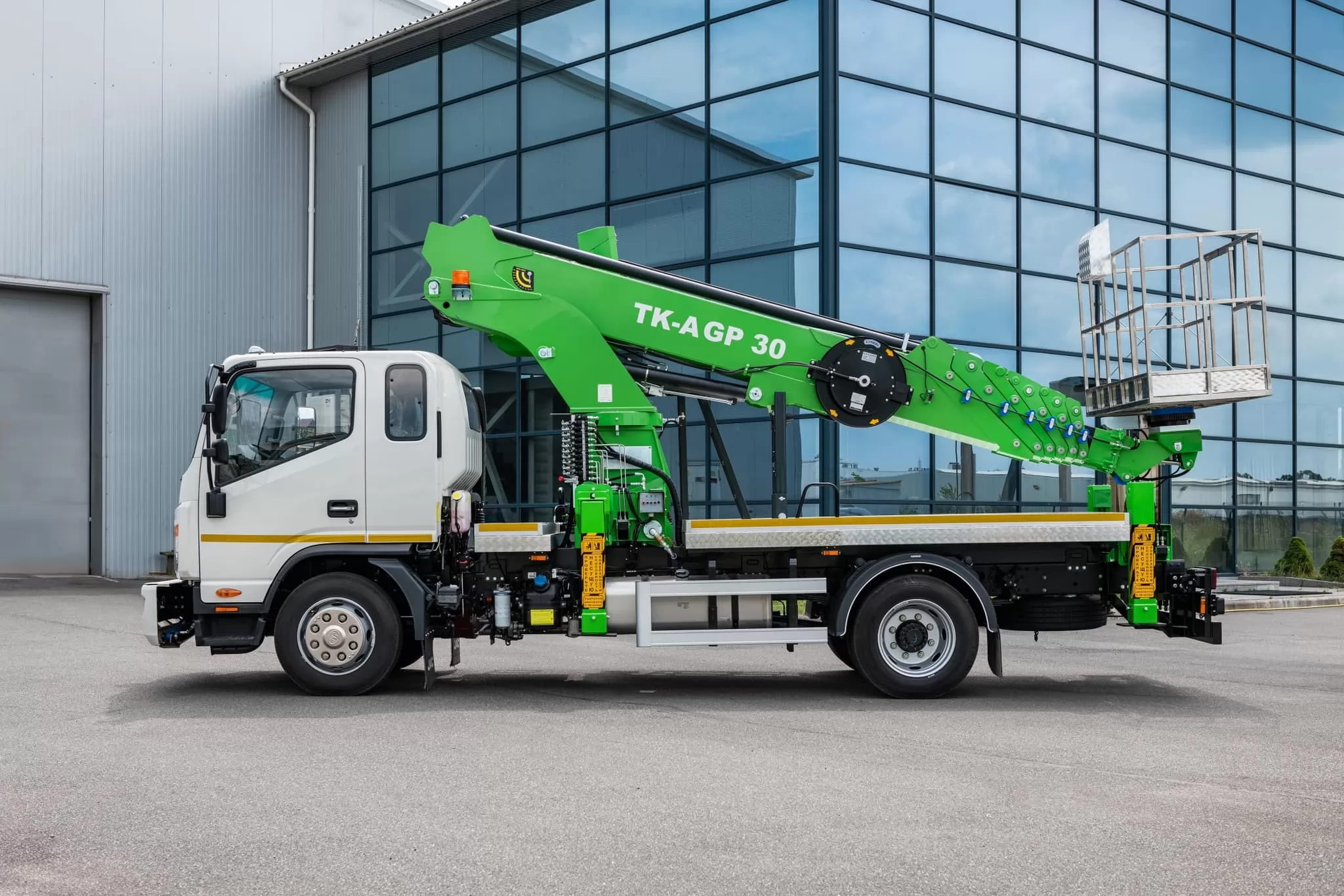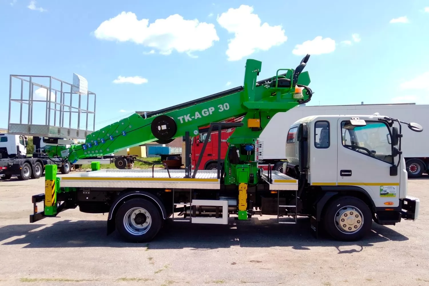 Автогидроподъемники из серии SKYMAN рассчитаны на рабочую высоту до 30 м, допустимая грузоподъемность люльки 300 кг, максимальный вылет 18 м.