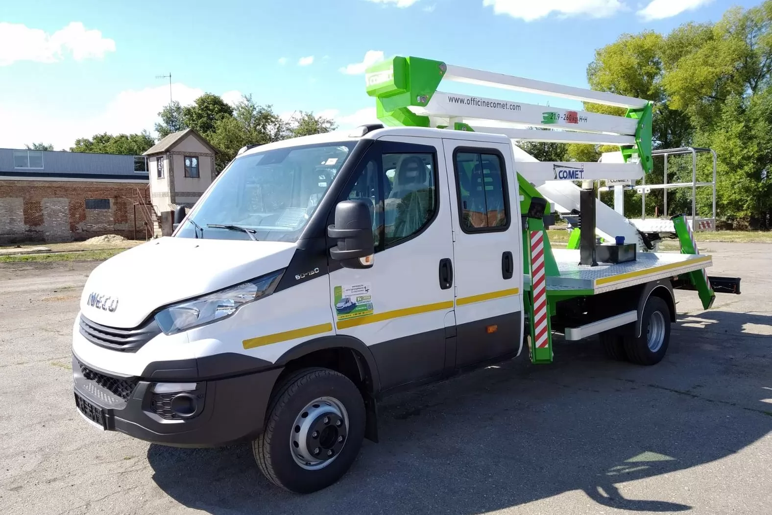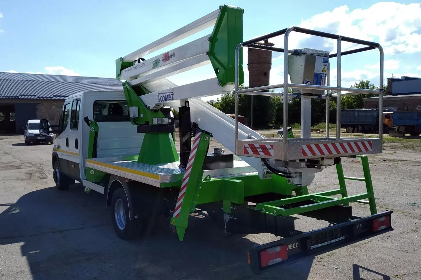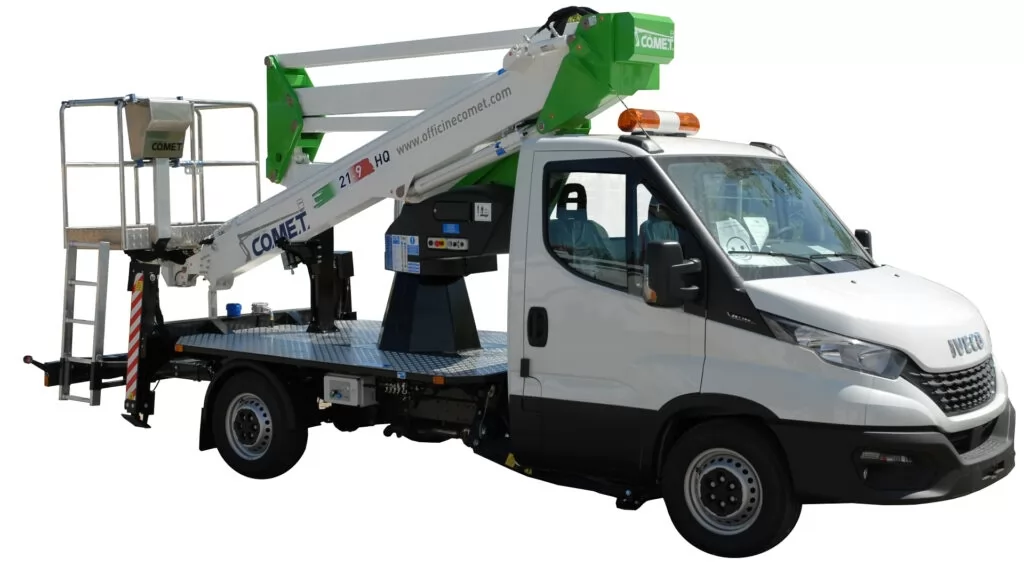 Модель Comet 21 | 2 | 9 HQ на IVECO Daily - комбінований автогідропідйомник, що встановлюється на вантажівках з мінімальною масою від 3,5 т. Максимальна робоча висота 20,5 м з максимальним вильотом 9 м. Безпечне робоче навантаження 260 кг. Обертання надземної частини становить 360 градусів. Подвійний пантограф.