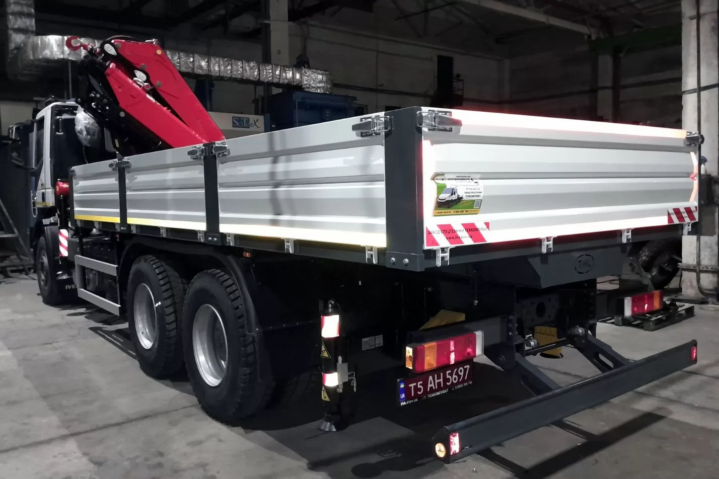 Бортовий автомобіль ТК-IV-КМ-365 на базі IVECO TRAKKER AD380T41 із крано-маніпуляторною установкою. 3-стороннє розвантаження бортів і наявність крано-маніпуляторної установки за кабіною робить модель ТК-IV-КМ-365 дуже зручною для завантаження/вивантаження вантажу, що перевозиться.