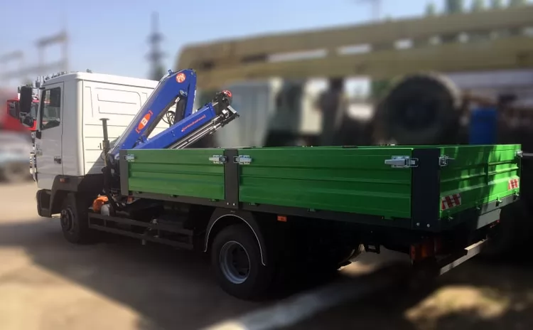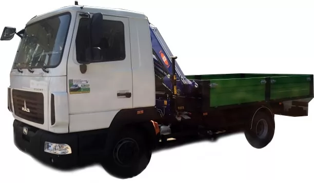 Вантажний автомобіль ТК-М-КМ-8023 - бортовий автомобіль із встановленою за кабіною крано-маніпуляторною установкою. Переобладнання вантажного шасі МАЗ-4371 під бортовий автомобіль ТК-М-КМ-8023 та монтаж крано-маніпуляторної установки PM 8023 зроблено на Заводі спецтехніки Техкомплект.