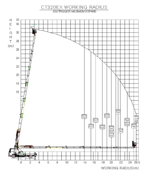 За допомогою автовишки DASAN CT320EX можна виконувати роботи різного рівня складності та інтенсивності на висоті до 32 м. Монтаж та сервіс електромереж або інженерних мереж, об'єктів кабельного телебачення, фасадні роботи (чистка, мийка, розміщення реклами, зняття бурульок та снігу) на багатоповерхових будинках, рятувальні роботи – ось стислий перелік висотних робіт, які може виконувати ця автовишка.