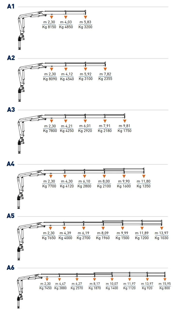 | Модель | Вантажний момент | В/п на мін. вильоті стріли | В/п на макс. вильоті стріли | Макс. висота підйому | Вага КМУ | К-ть секцій |