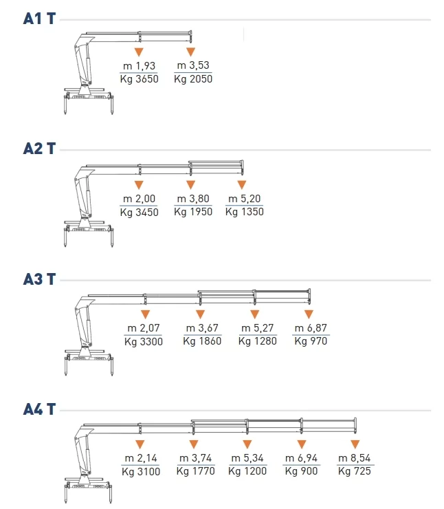 | Модель | Max вантажний момент | Вантажопідйомність на max вильоті | Max вантажопідйомність на min вильоті | Макс.висота підйому | Вага КМУ (кг) | К-ть секцій стріли |