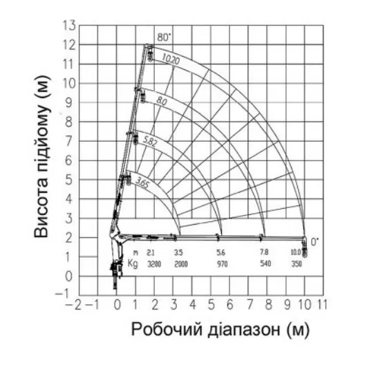 | Модель | Max вантажний момент | Вантажопідйомність на min/max вильоті | Min/max виліт | Вага КМУ (кг) | К-ть секцій стріли |