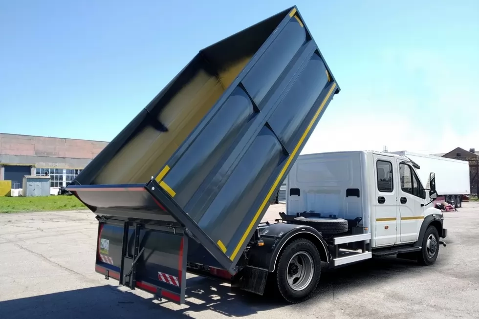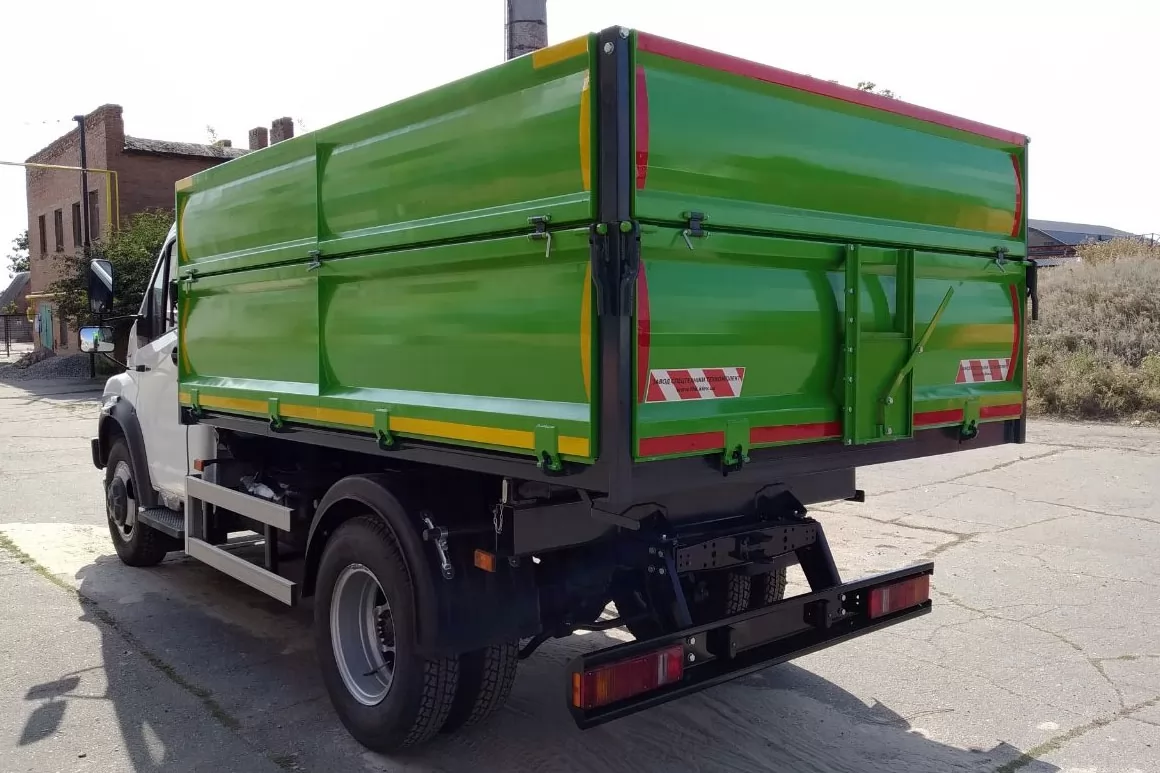 Кузов металлический прямобортный с откидными задним и боковыми бортами. Направление разгрузки на три стороны. Основное назначение - перевозка с/х грузов, сыпучих строительных материалов. Самосвал GAZON NEXT 1200 мм имеет трёхсторонний тип разгрузки, боковая и задняя. Благодаря этому разгружать самосвал GAZON NEXT 1200 мм можно в абсолютно любом положении и в самых труднодоступных местах.
